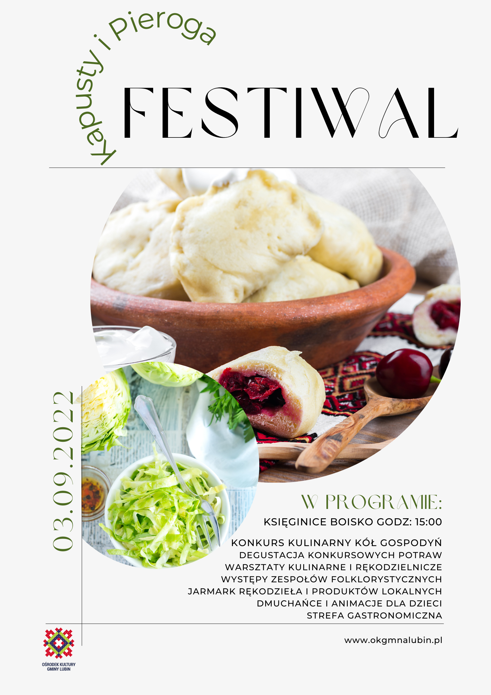 Przed nami 13 FESTIWAL KAPUSTY I PIEROGA w Księginicach. Ruskie, z kapustą, kaszą, owocami, ziemniakami a nawet botwinką. Bigos, kapusta zasmażana, na słodko, na kwaśno. To przykłady tylko kilu potraw, które można podziwiać i degustować podczas każdorocznej edycji festiwalu. W tym roku oprócz degustacji dań stworzonych przez koła gospodyń będzie można zakupić pierogi na wynos do domu. Całość imprezy wzbogacą występy regionalnych zespołów, animacje i dmuchańce dla dzieci oraz warsztaty kulinarne i rękodzielnicze. O szczegółach warsztatów będziemy informować w następnych postach.